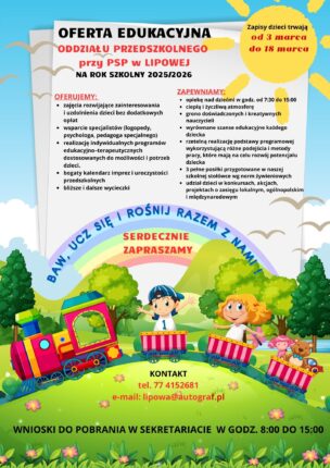 DYREKTOR PUBLICZNEJ SZKOŁY PODSTAWOWEJ W LIPOWEJ OGŁASZA ZAPISY DZIECI DO ODDZIAŁU PRZEDSZKOLNEGO NA ROK SZKOLNY 2025/2026 Składanie wniosków o przyjęcie do oddziału przedszkolnego odbywa się w terminie od 03 do 18 marca 2025r. W rekrutacji nie biorą udziału dzieci, które w roku szkolnym 2024/2025 uczęszczają do oddziału przedszkolnego. Rodzice tych dzieci składają jedynie deklarację kontynuowania […]