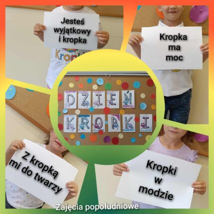 15 września obchodziliśmy w szkole i przedszkolu Dzień Kropki – międzynarodowe święto kreatywności, odwagi i odkrywania własnych talentów. Mała kropka, a może zainspirować wielkie pomysły. Nie bój się zaczynać od małego – wszystko wielkie zaczyna się od jednej kropki !