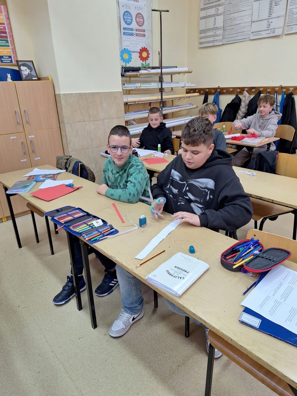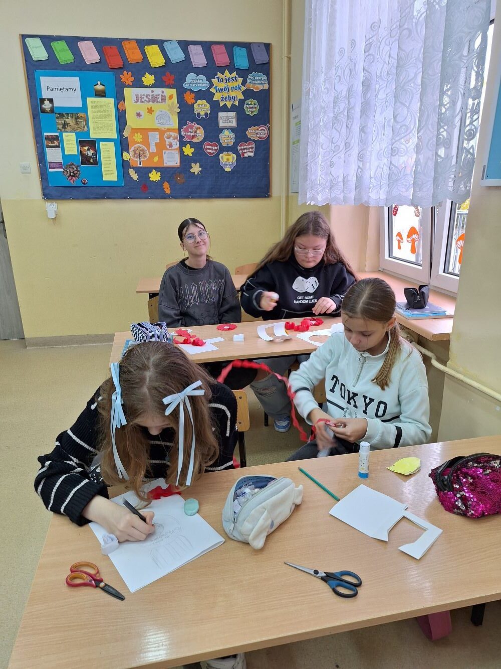 Uczniowie klas młodszych w trakcie zajęć „Przy takich dziewczynach nie można się było bać. Bohaterki Powstania Warszawskiego w walce o wolność” nie tylko zdobywali nowe wiadomości, ale też przygotowali prace plastyczne pod hasłem „Odznaczenie dla bohaterki Powstania Warszawskiego”.