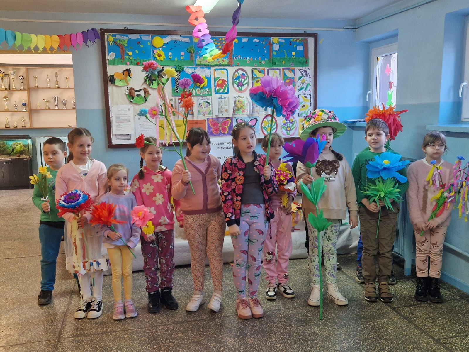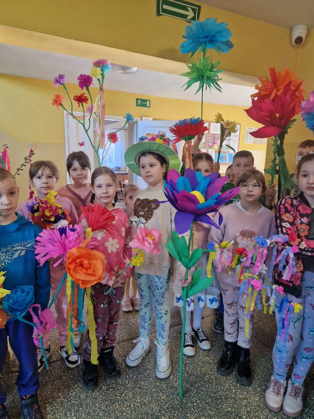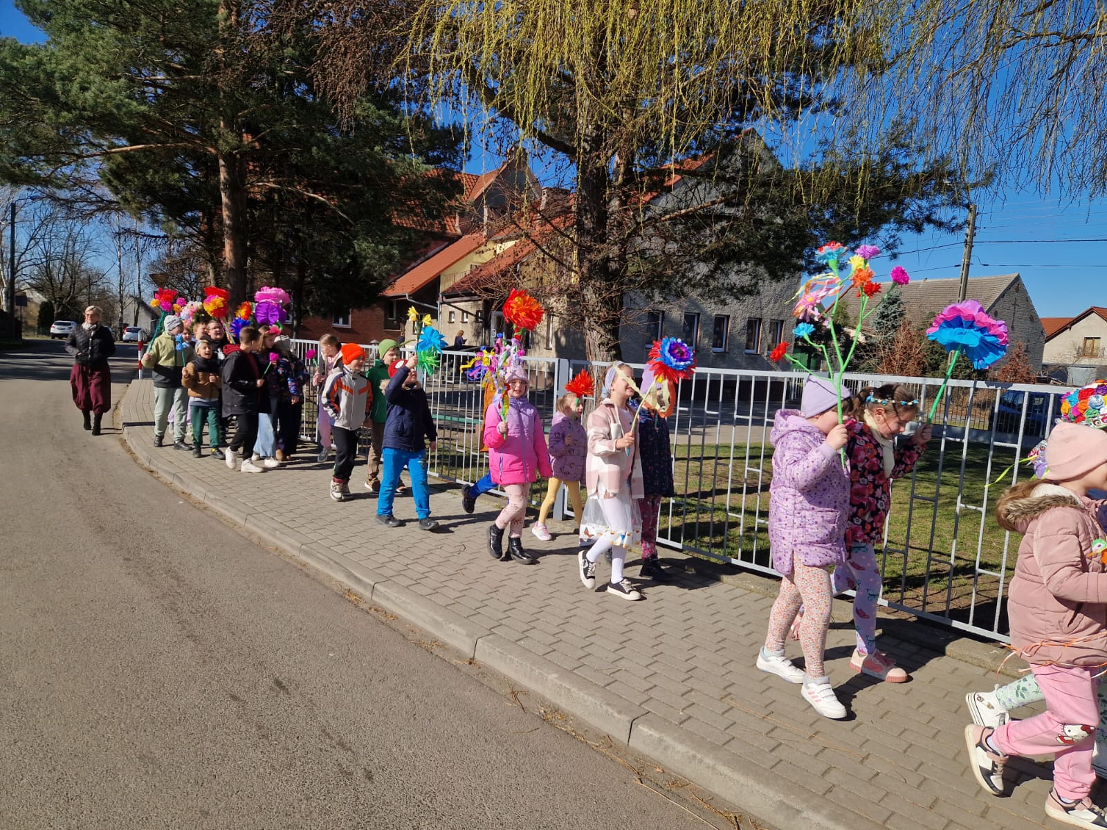 Zgodnie z tradycją 20 marca 2025r. odbyło się uroczyste powitanie Pani Wiosny. Ten dzień rozpoczęliśmy od występów wokalnych oraz wierszy przygotowanych przez uczniów klas 1-3 oraz grupy przedszkolne. Następnie wraz z Marzanną, kolorowymi kwiatami i gaikami wyszliśmy powitać oficjalnie Panią Wiosnę. Dzieci głośnym śpiewem i radosnymi okrzykami „ Żegnaj Zimo, Witaj Wiosno!” przegnały zimę i powitały wiosnę.