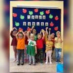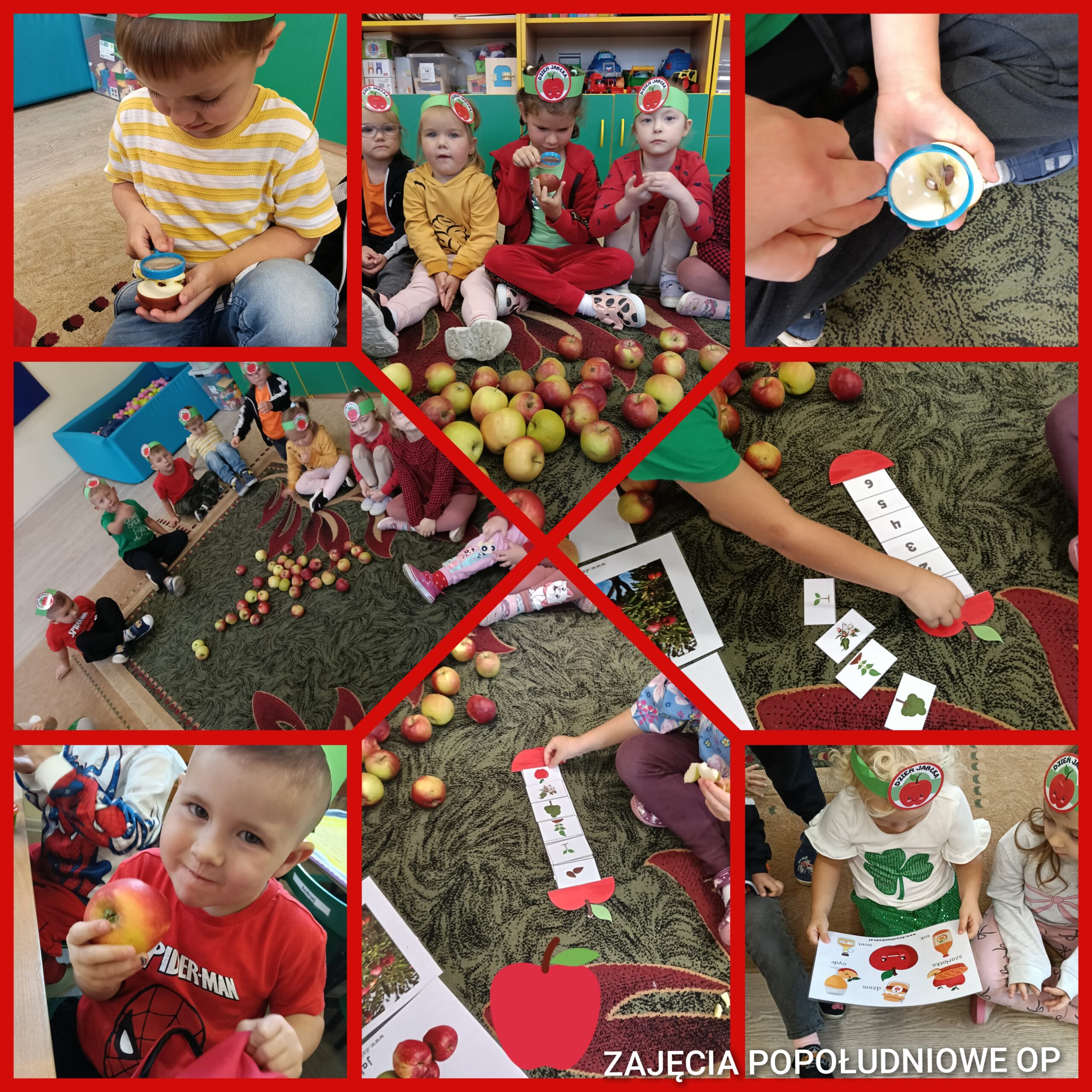 30.09.2025 r. podczas popołudniowych zajęć nasze przedszkolaki świętowały Dzień Jabłka. Rozmawialiśmy o kształcie, kolorze, wartościach odżywczych i smakowych jabłek, oglądaliśmy pestki przez lupę, a także bawiliśmy się w różne „jabłkowe” zabawy. Dzieci dopasowywały kształty geometryczne, układały połówki jabłek w pary, szukały literek w słowie „jabłko” i porządkowały je od najmniejszego do największego.