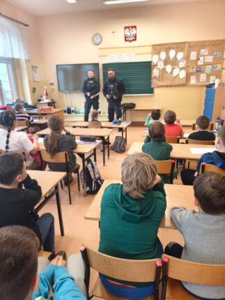 W dniu 30.01.2026 odbyło się spotkanie z policjantami, którzy rozmawiali z dziećmi o bezpiecznych feriach. Ważnym elementem spotkania była rozmowa o przestrzeganiu zasad podczas uprawiania sportów zimowych. W spotkaniu uczestniczyły dzieci z klas I,III,IV.
