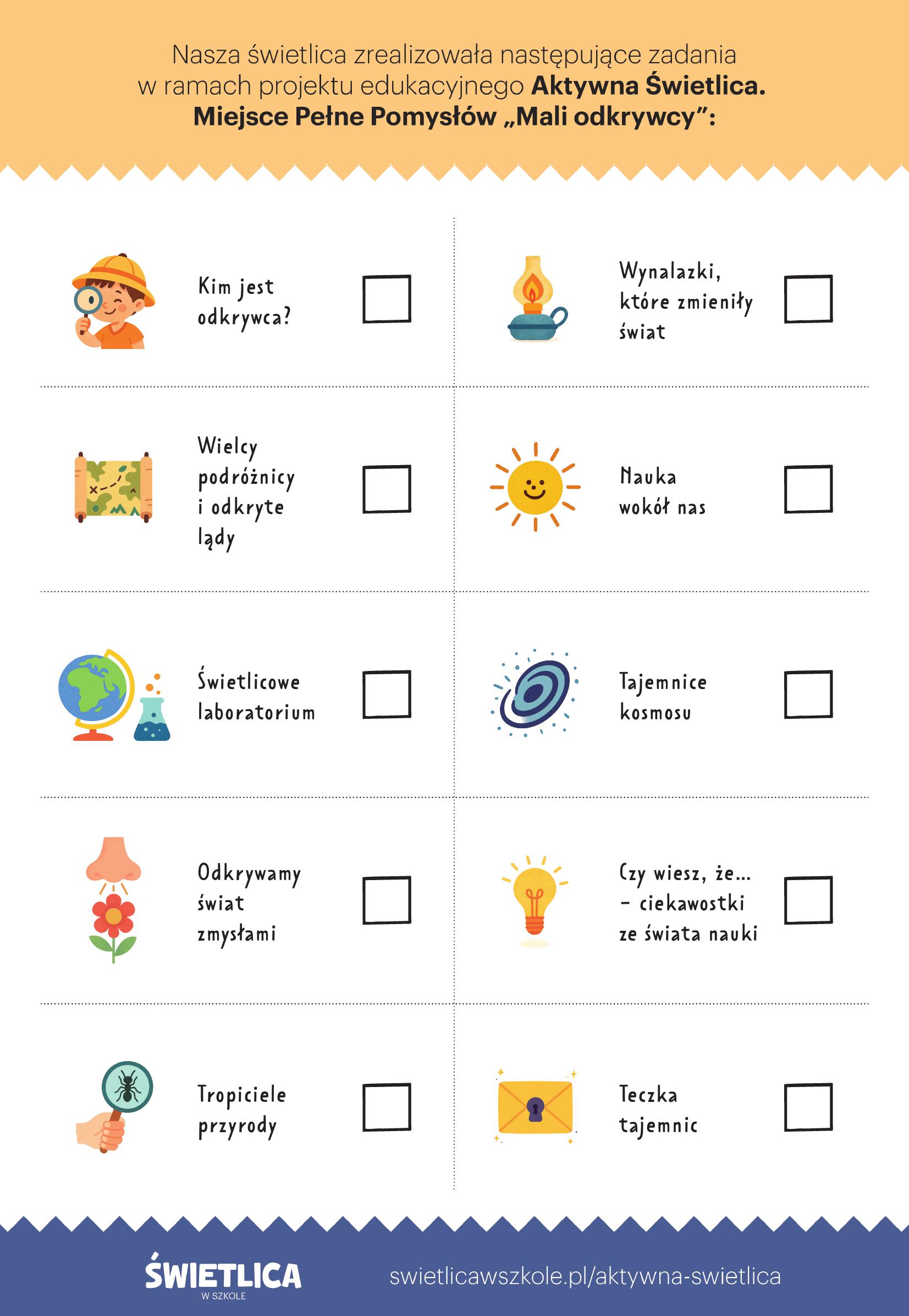 Uczniowie uczęszczający na zajęcia świetlicy szkolnej biorą udział w projekcie „Aktywna świetlica. Miejsce pełne pomysłów. Mali odkrywcy.” Celem projektu jest: