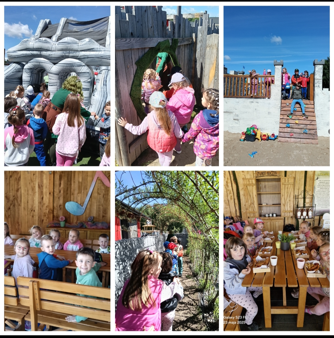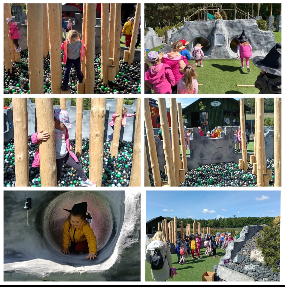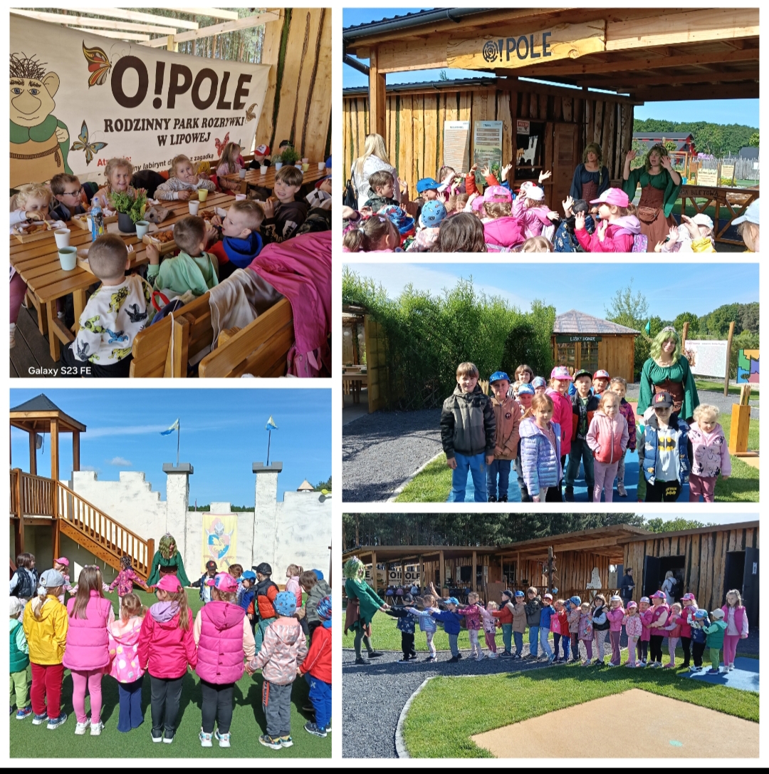23 maja nasze przedszkolaki wybrały się na pełną przygód wycieczkę do Parku Rozrywki „O!Pole Lipowa”. Był to dzień pełen radości, ruchu i niezapomnianych wrażeń!Naszym przewodnikiem po parku była niezwykła postać – sympatyczna trollka o imieniu Papillo która z humorem i energią prowadziła nas przez kolejne atrakcje. Dzieci miały okazję zmierzyć się z wielkim labiryntem, w którym trzeba było wykazać się sprytem i orientacją w terenie. Ogromną frajdę sprawił także średniowieczny tor przeszkód – mali odkrywcy z zapałem pokonywali kolejne wyzwania, wspinając się, skacząc i balansując. Przedszkolaki uczestniczyły także w „Zielonych Warsztatach”oraz lekcji botaniki. Nie zabrakło też spotkania ze zwierzętami. Na parkowej farmie dzieci mogły z bliska podziwiać i pogłaskać kozy kameruńskie oraz osiołki. Kontakt ze zwierzętami dostarczył dzieciom wiele radości i był okazją do poznania ich zwyczajów. Po intensywnym czasie pełnym zabawy na dzieci czekał smaczny i magiczny poczęstunek oraz bajkowe, parujące eliksiry owocowe, które wyglądały jak prawdziwe mikstury z krainy baśni. Taka niespodzianka dodała sił na dalsze odkrywanie parku! To była wspaniała wycieczka, która na długo zostanie w naszej pamięci. Dzieci wróciły do przedszkola pełne emocji, uśmiechu i opowieści o swoich przygodach.