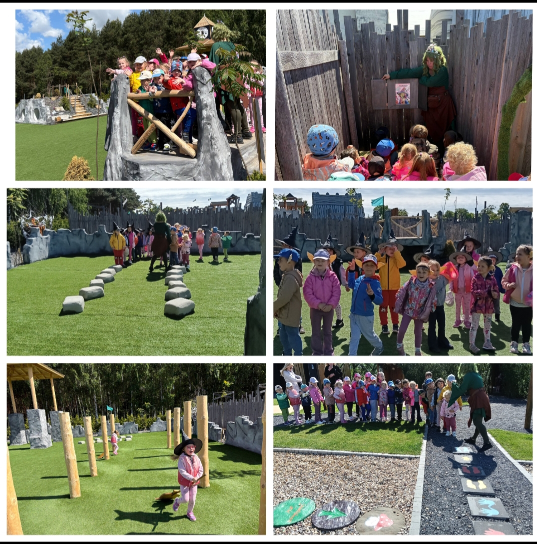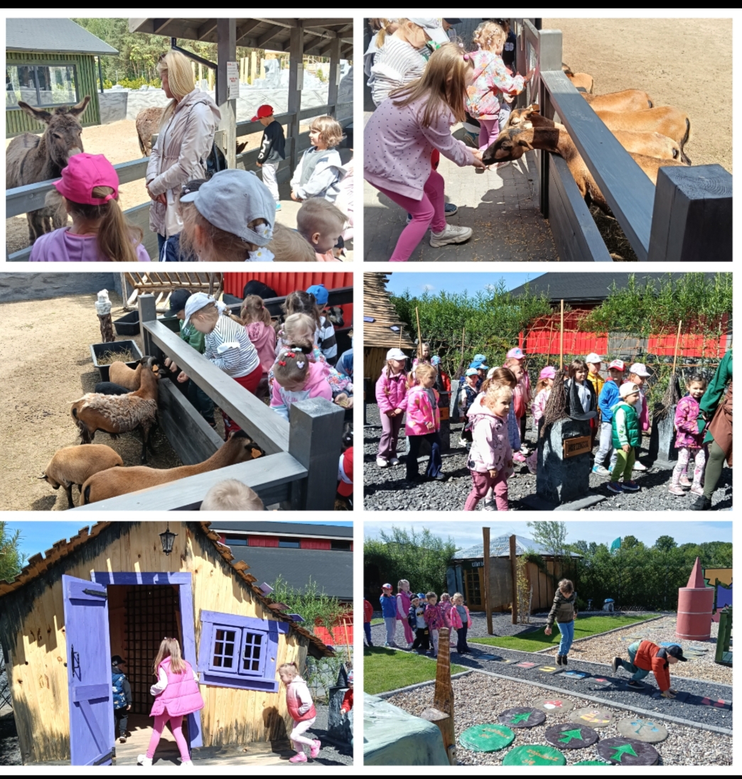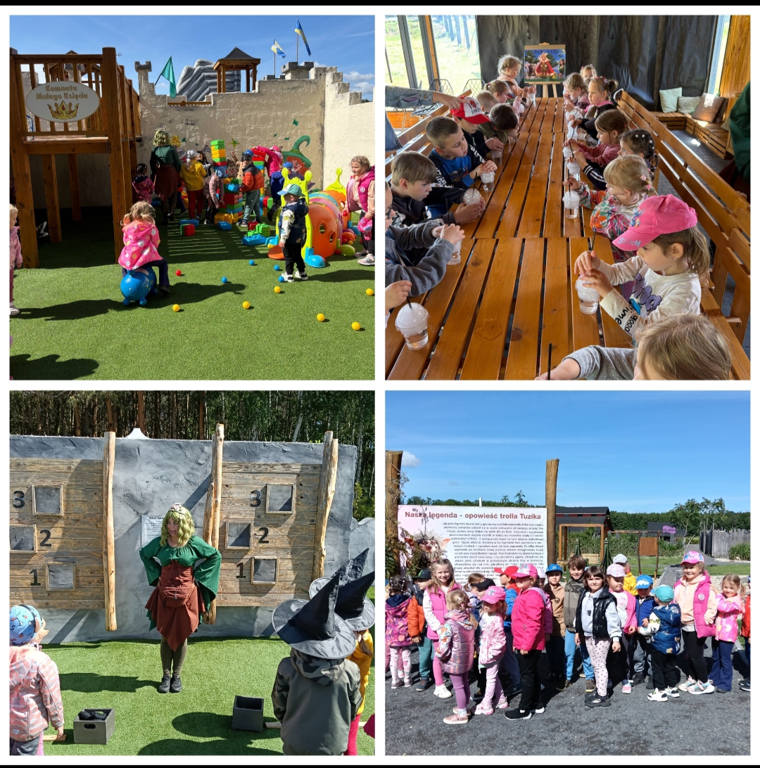 23 maja nasze przedszkolaki wybrały się na pełną przygód wycieczkę do Parku Rozrywki „O!Pole Lipowa”. Był to dzień pełen radości, ruchu i niezapomnianych wrażeń!Naszym przewodnikiem po parku była niezwykła postać – sympatyczna trollka o imieniu Papillo która z humorem i energią prowadziła nas przez kolejne atrakcje. Dzieci miały okazję zmierzyć się z wielkim labiryntem, w którym trzeba było wykazać się sprytem i orientacją w terenie. Ogromną frajdę sprawił także średniowieczny tor przeszkód – mali odkrywcy z zapałem pokonywali kolejne wyzwania, wspinając się, skacząc i balansując. Przedszkolaki uczestniczyły także w „Zielonych Warsztatach”oraz lekcji botaniki. Nie zabrakło też spotkania ze zwierzętami. Na parkowej farmie dzieci mogły z bliska podziwiać i pogłaskać kozy kameruńskie oraz osiołki. Kontakt ze zwierzętami dostarczył dzieciom wiele radości i był okazją do poznania ich zwyczajów. Po intensywnym czasie pełnym zabawy na dzieci czekał smaczny i magiczny poczęstunek oraz bajkowe, parujące eliksiry owocowe, które wyglądały jak prawdziwe mikstury z krainy baśni. Taka niespodzianka dodała sił na dalsze odkrywanie parku! To była wspaniała wycieczka, która na długo zostanie w naszej pamięci. Dzieci wróciły do przedszkola pełne emocji, uśmiechu i opowieści o swoich przygodach.