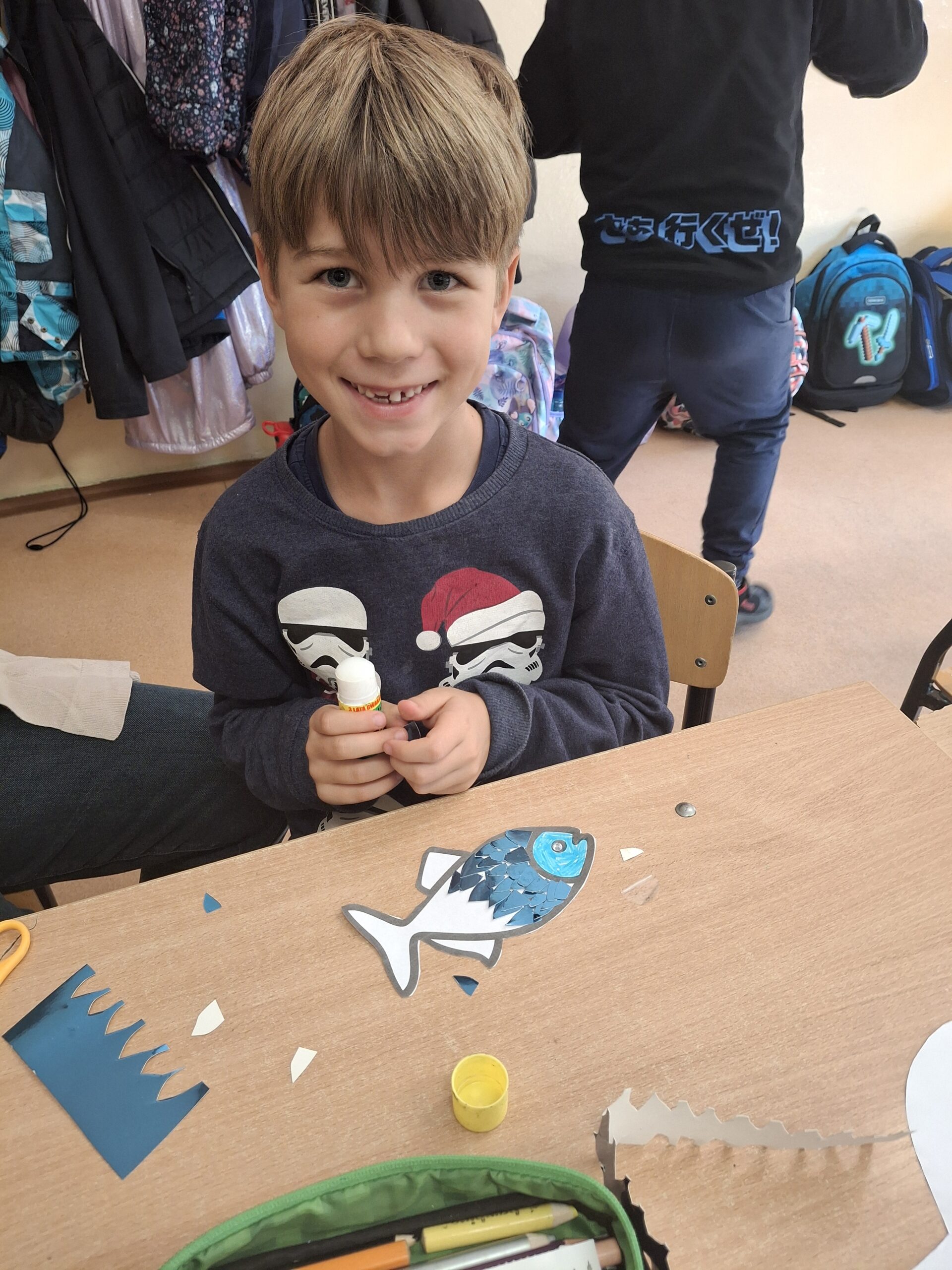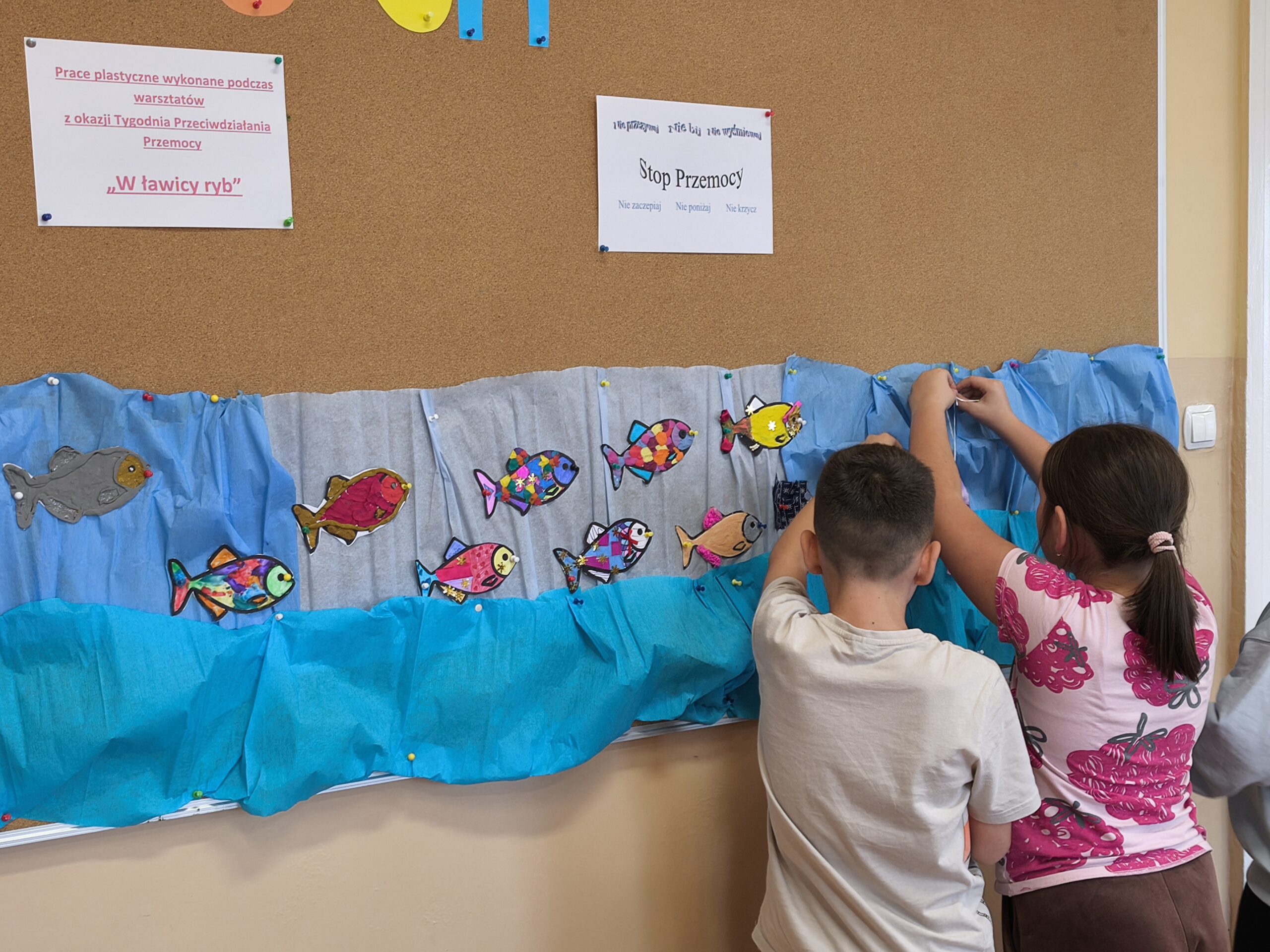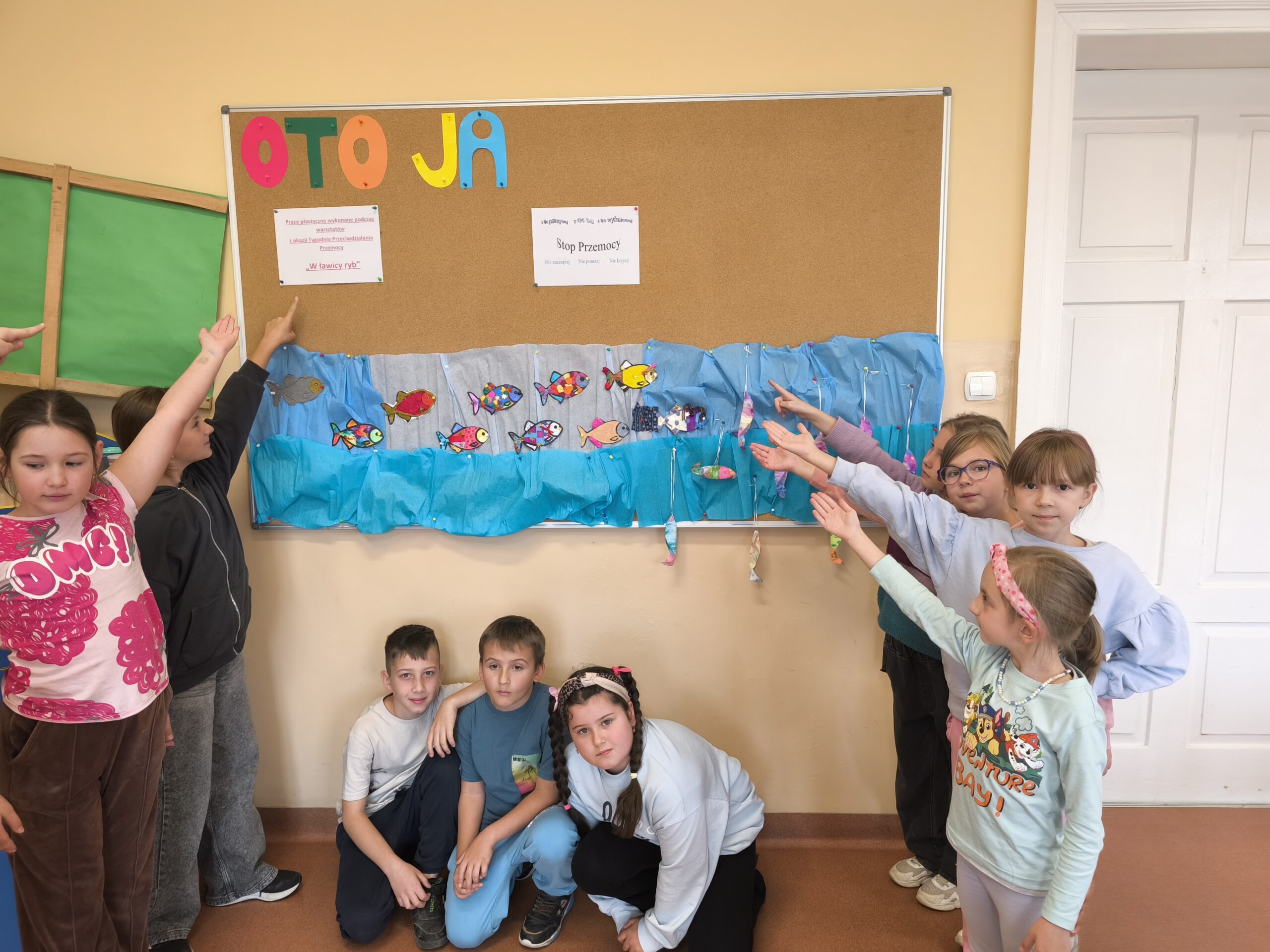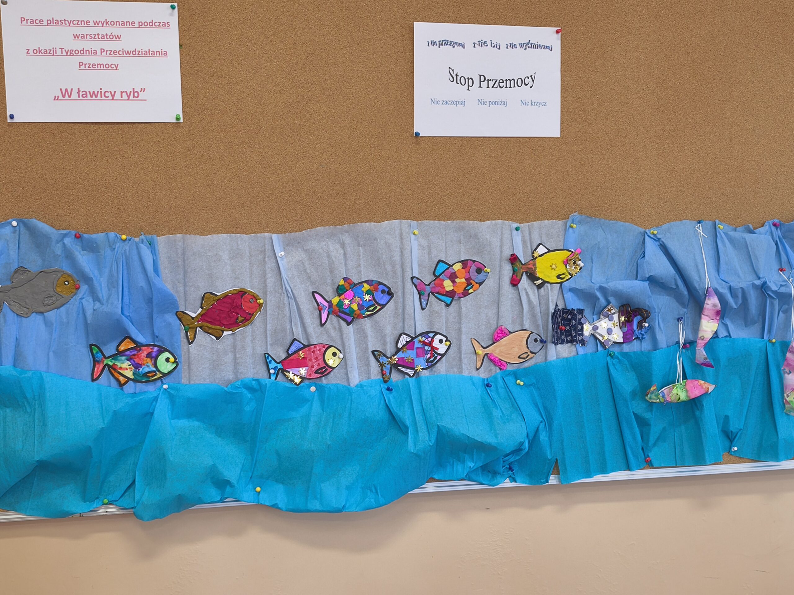 W piątek 3.10.2025r. uczniowie klasy I i III realizowali zajęcia w ramach tygodnia przeciwdziałania przemocy- Stop przemocy, tytuł zajęć „ W sieci”. Zdjęcia są efektem pracy uczniów- nasze klasowe ławice, w których każda rybka jest jednakowo ważna i każda stanowi nieodłączny element ławicy- klasy. Dzieci bardzo aktywnie uczestniczyły w zajęciach i pięknie pracowały. Dowodem są kolorowe, wykonane według własnego pomysłu rybki i wspólna ławica.