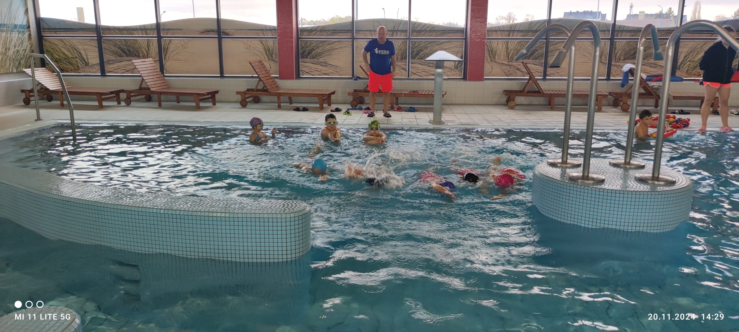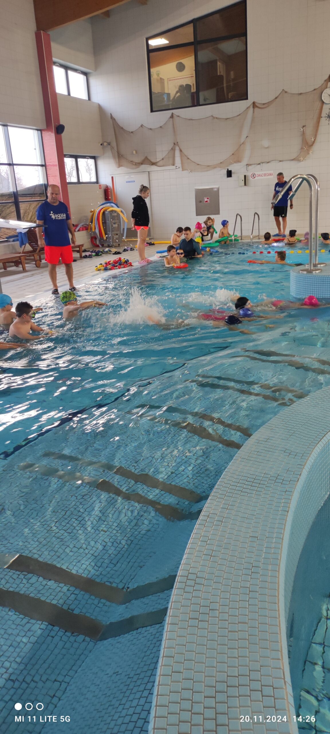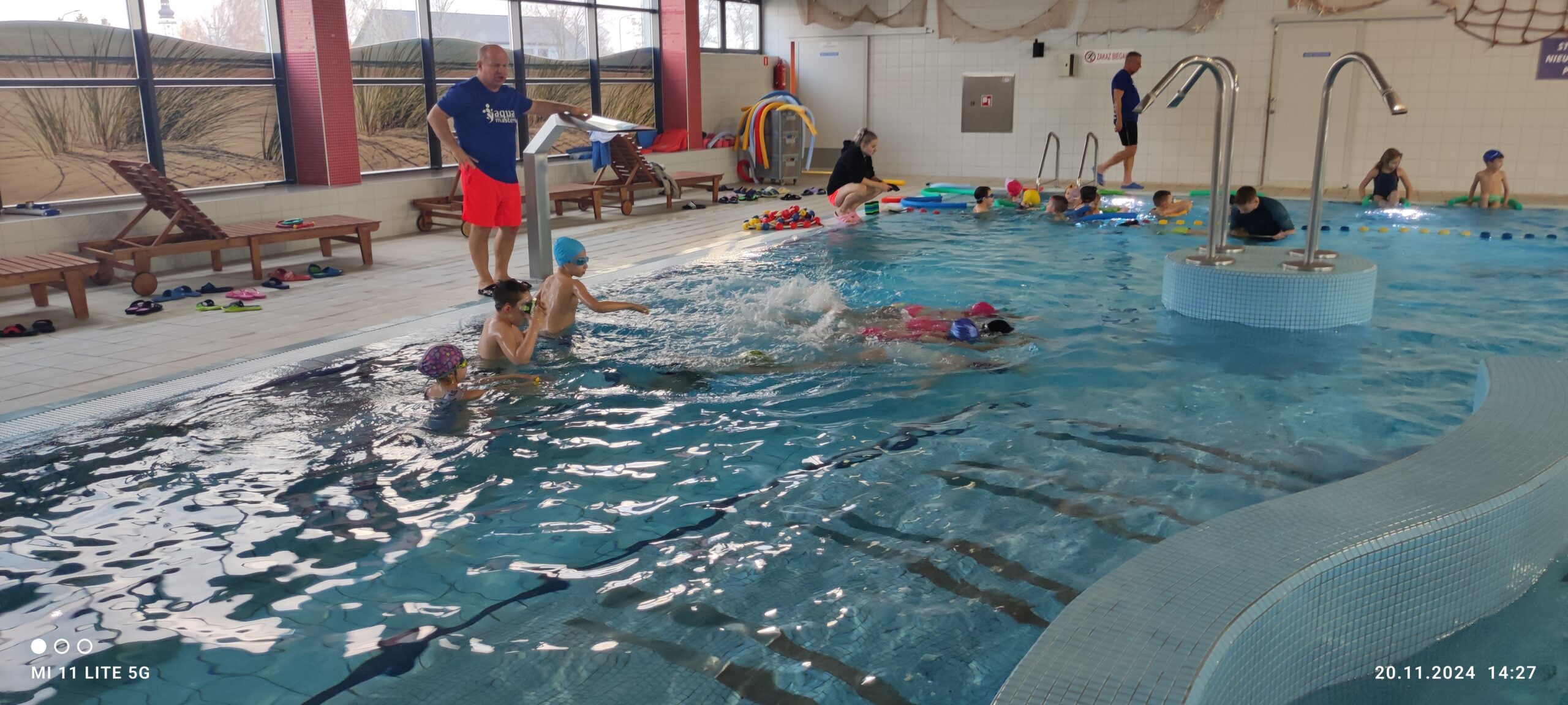 Klasa II wraz z wychowawcą od 25 września do 27 listopada 2024r. uczestniczyła w programie „Umiem pływać” 2024. Założeniem programu był systematyczny i powszechny udział dzieci w pozalekcyjnych i pozaszkolnych zajęciach sportowych.  Jego główny cel to aktywizacja fizyczna dzieci szkolnych, nabycie podstawowych umiejętności pływania, profilaktyka wad postawy oraz nadwagi i otyłości. Należy podkreślić, że spora część dzieci z klasy II bardzo chętnie uczestniczyła w zajęciach prowadzonych na basenie, bez względu na poziom umiejętności i sprawności fizycznej. Okazało się, że po 10 lekcjach mali pływacy mają lepszą koordynację ruchową, są bardziej sprawni, wykazują większą odwagą od niepływających rówieśników. Dzięki tej inicjatywie dzieci zdobyły cenne umiejętności, które będą im towarzyszyć przez całe życie, a być może niektóre z nich odkryją w sobie pasję do sportów wodnych.