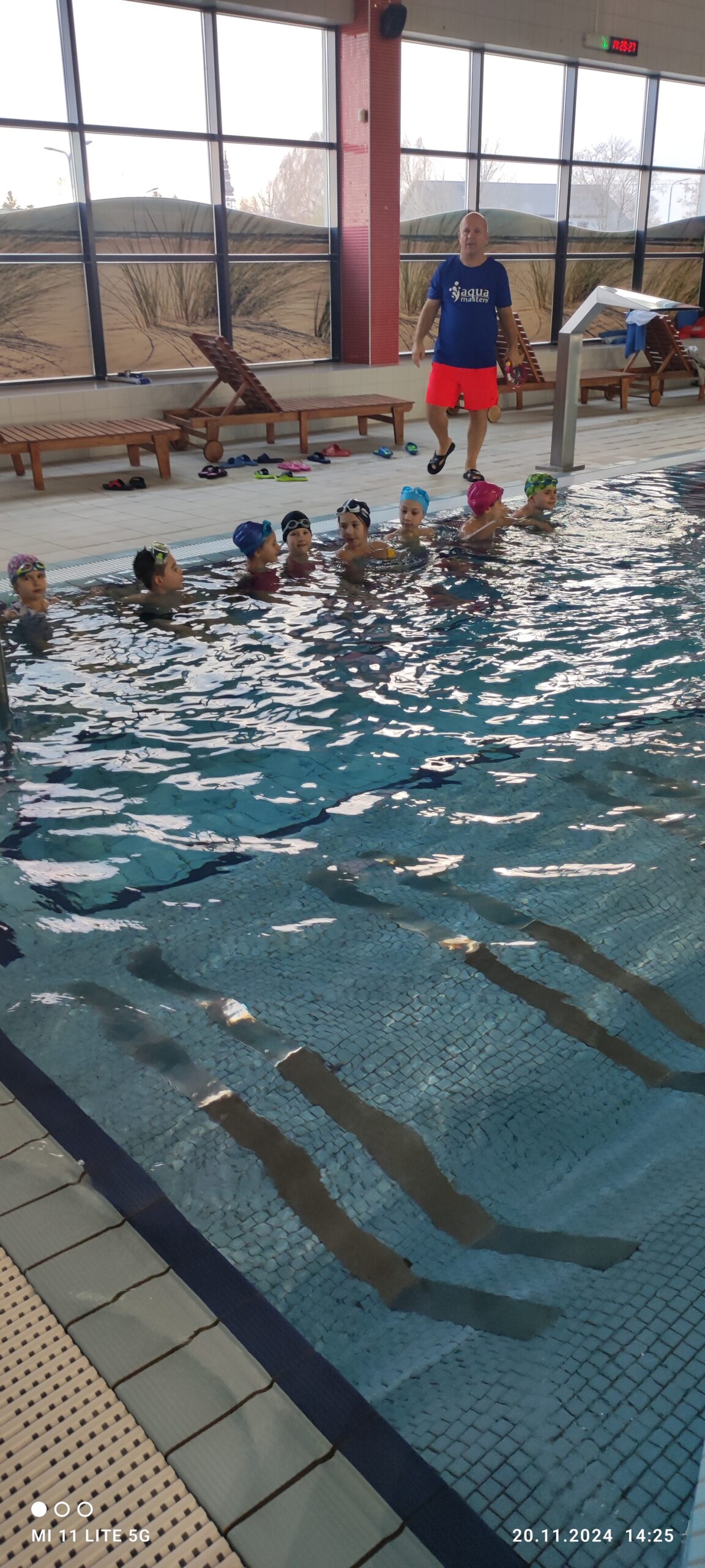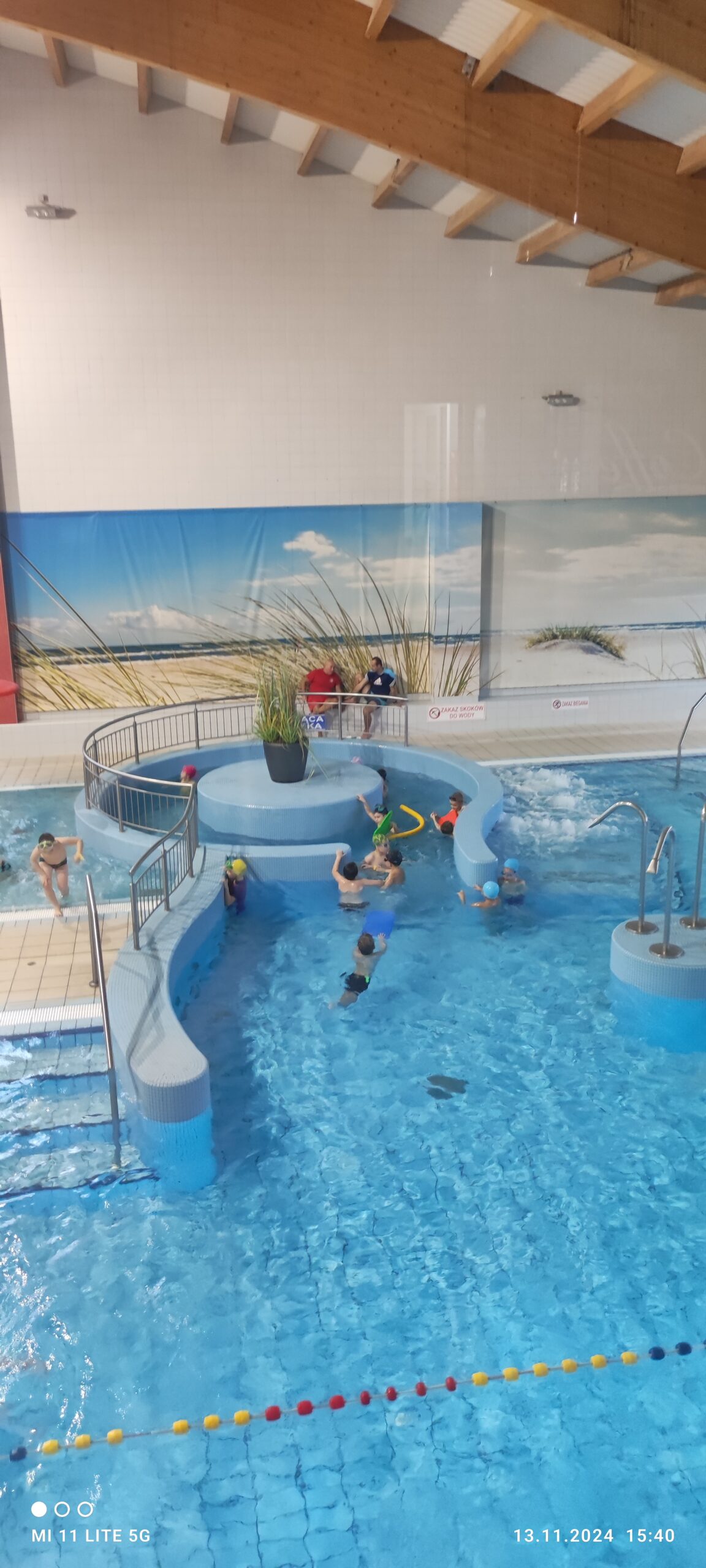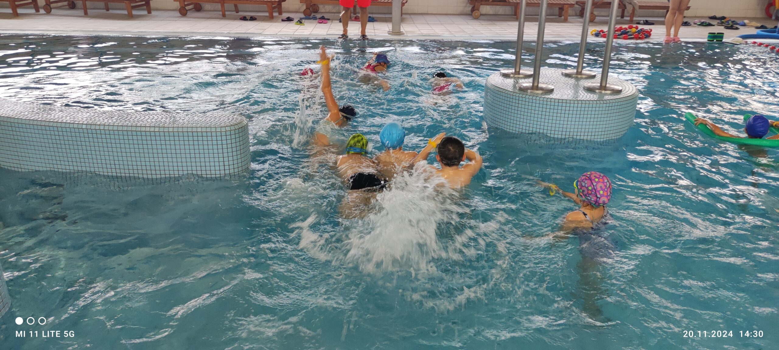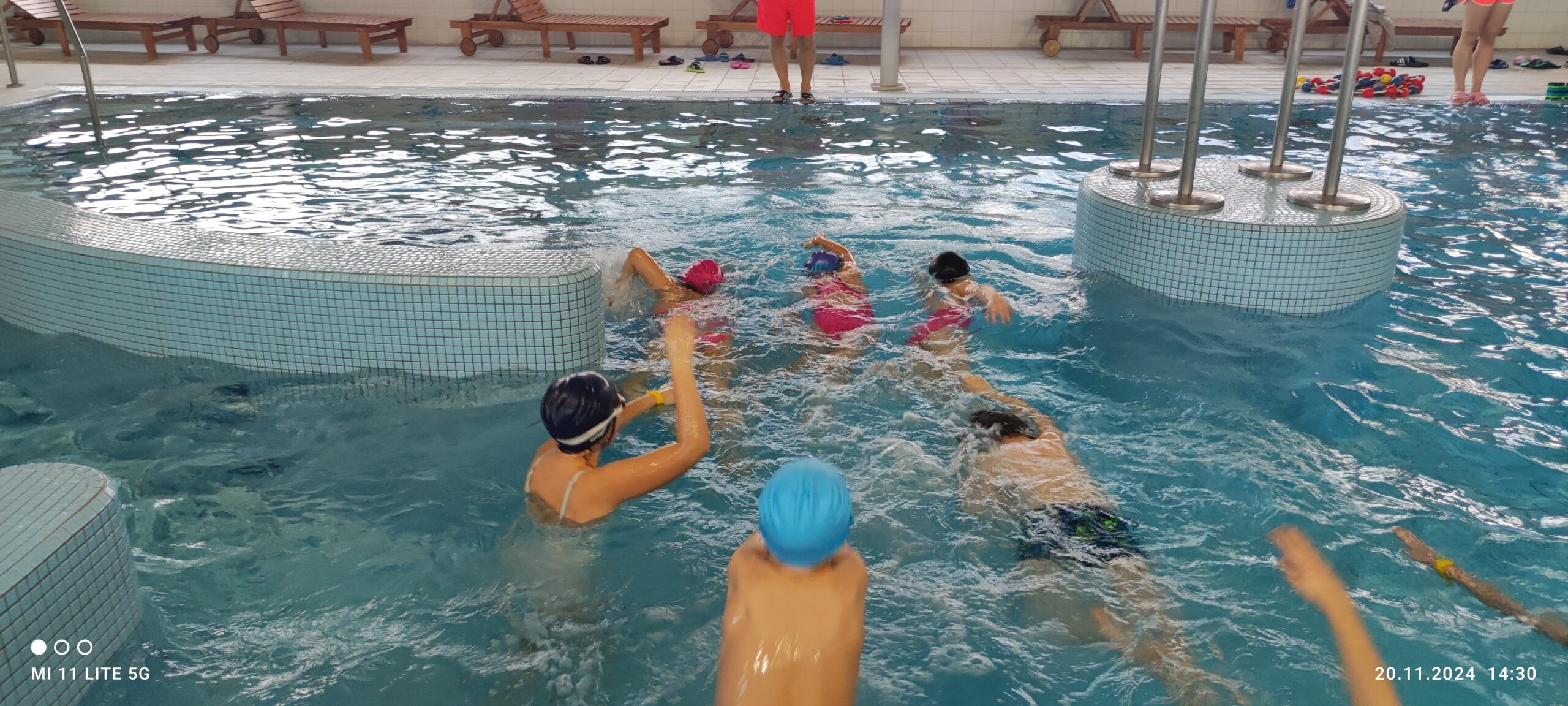 Klasa II wraz z wychowawcą od 25 września do 27 listopada 2024r. uczestniczyła w programie „Umiem pływać” 2024. Założeniem programu był systematyczny i powszechny udział dzieci w pozalekcyjnych i pozaszkolnych zajęciach sportowych.  Jego główny cel to aktywizacja fizyczna dzieci szkolnych, nabycie podstawowych umiejętności pływania, profilaktyka wad postawy oraz nadwagi i otyłości. Należy podkreślić, że spora część dzieci z klasy II bardzo chętnie uczestniczyła w zajęciach prowadzonych na basenie, bez względu na poziom umiejętności i sprawności fizycznej. Okazało się, że po 10 lekcjach mali pływacy mają lepszą koordynację ruchową, są bardziej sprawni, wykazują większą odwagą od niepływających rówieśników. Dzięki tej inicjatywie dzieci zdobyły cenne umiejętności, które będą im towarzyszyć przez całe życie, a być może niektóre z nich odkryją w sobie pasję do sportów wodnych.