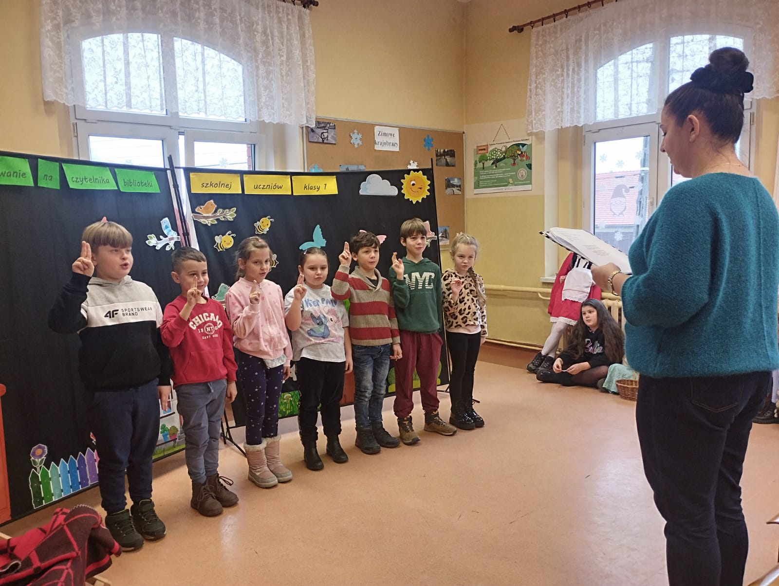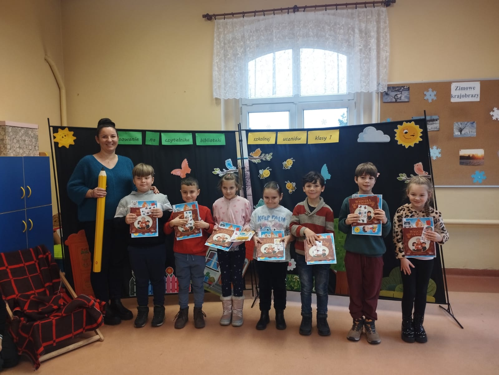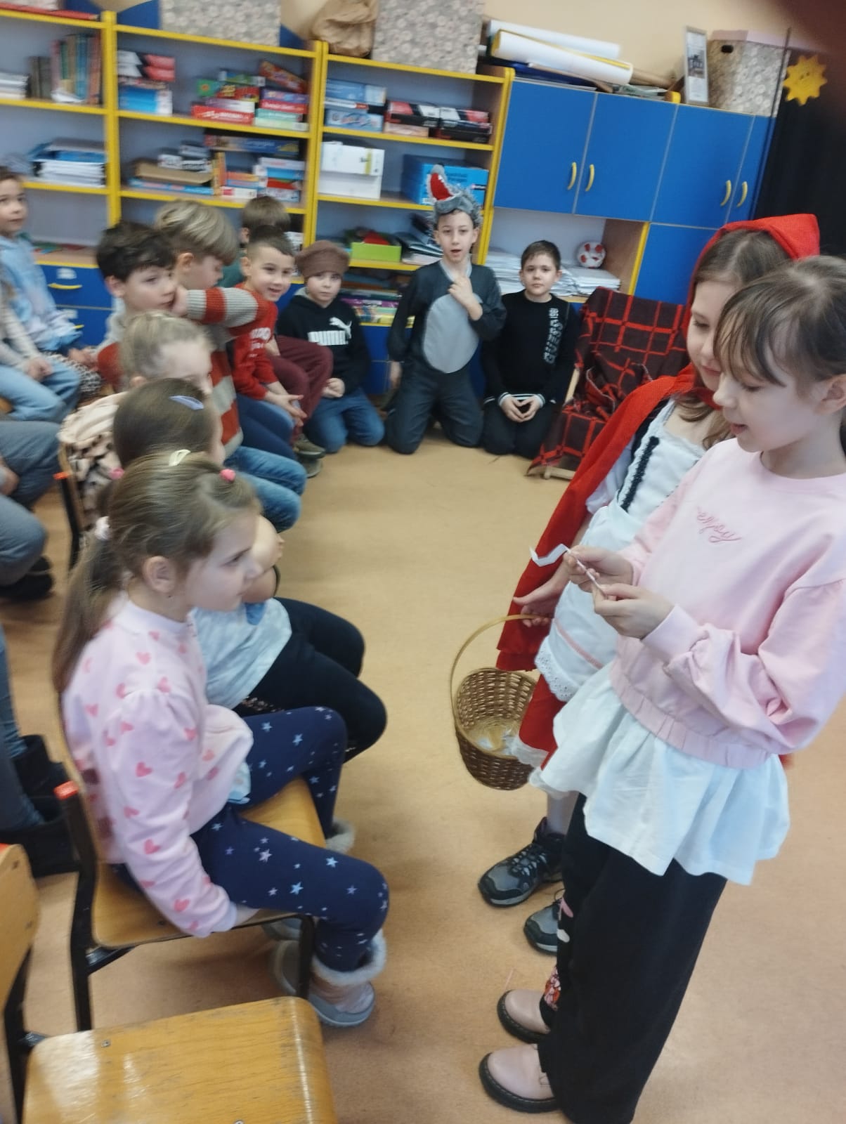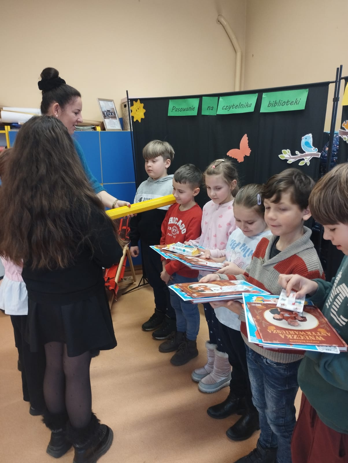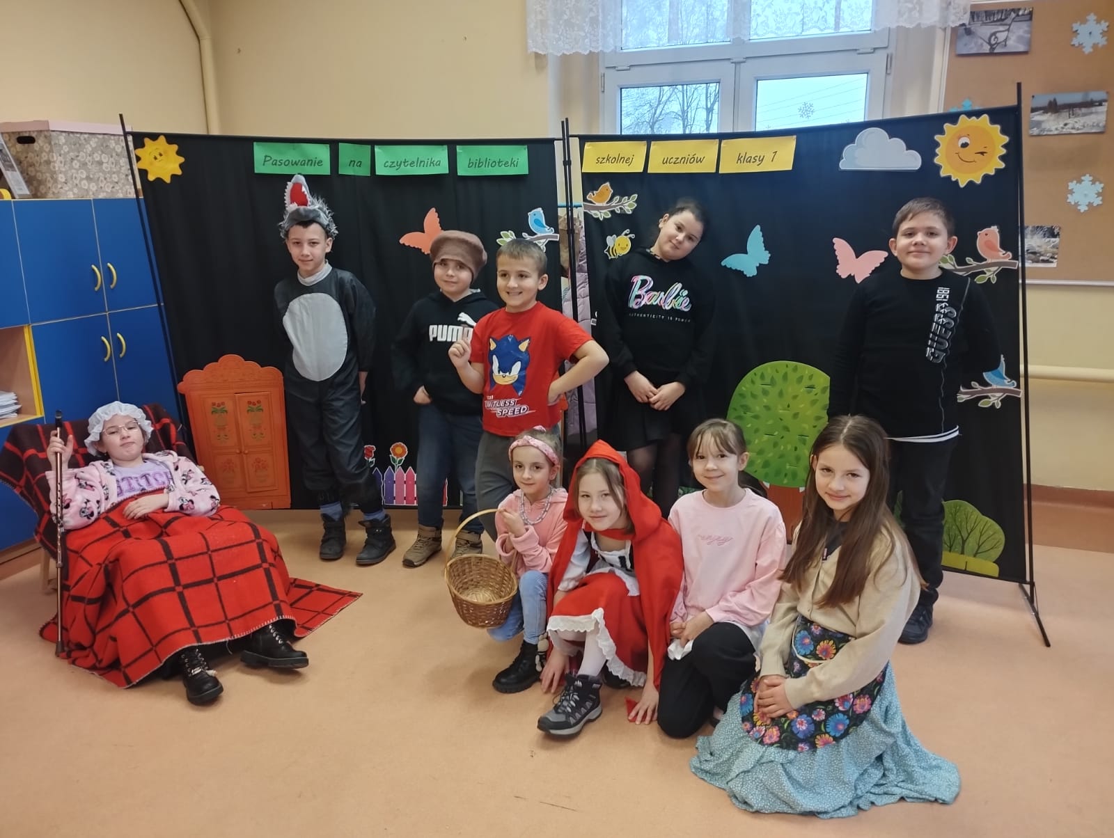 W dniu 23 stycznia 2026r. biblioteka szkolna przyjęła w poczet swoich czytelników uczniów klas I. Głównym celem uroczystości było zachęcenie najmłodszych uczniów do korzystania z biblioteki szkolnej i rozwijania umiejętności czytania. Starsi koledzy i koleżanki z klasy III zaprezentowali teatrzyk wcielając się w bohaterów bajki pt. „Czerwony Kapturek”, urzekli wszystkich niezwykłą grą aktorską. Następnie pierwszoklasiści odgadywali zagadki związane z postaciami bajkowymi, a także odpowiadali na pytania dotyczące pracy biblioteki. Po wykonaniu wszystkich zadań uczniowie przyrzekli, że będą kochać i szanować książki, korzystać z ich mądrości i sumiennie wypełniać obowiązki czytelnika. Aktu pasowania na czytelnika biblioteki szkolnej dokonała pani Anna Warowa – Kręcichwost. Na pożegnanie nowi czytelnicy otrzymali książki, pamiątkowe dyplomy oraz personalizowane zakładki do książek, natomiast uczniowie klasy III przygotowali słodki podarunek, za co serdecznie dziękujemy. Dla pierwszoklasistów, ten dzień był pełen wrażeń. Zapewne na długo pozostanie w ich pamięci.