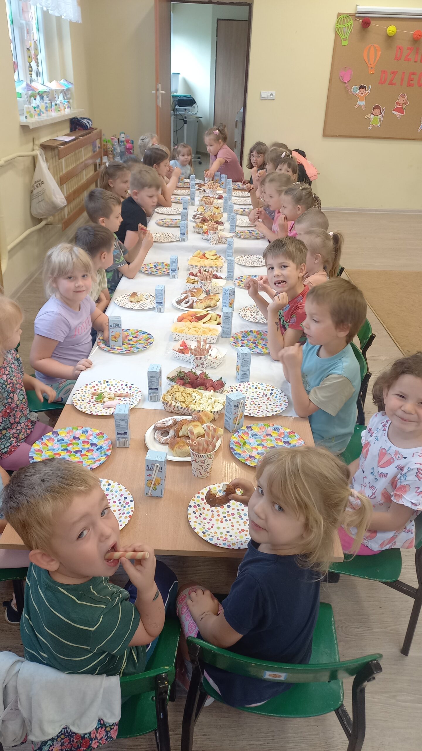 Każdy dzień w przedszkolu może być ciekawy jednakże jest taki dzień w roku, kiedy dzieci czują się szczególnie ważne, a wszyscy dorośli chcą im sprawić radość. To Dzień Dziecka – dzień, który uwielbiają wszystkie dzieci, te małe i te duże. To dzień pełen uśmiechów, zabawy, niespodzianek, radości i wielu niezapomnianych wrażeń! W Naszym przedszkolu tego dnia również nie zabrakło atrakcji. Były tańce, zabawy ruchowo-integracyjne, konkursy sportowe, pyszny poczęstunek, kolorowanki 3D, kolorowe balony i wiele innych niespodzianek. Mamy nadzieję, że ten dzień, który obfitował w mnóstwo pozytywnych wrażeń będzie mile wspominany przez dzieci. Jeszcze raz życzymy wszystkim naszym dzieciom dużo radości i uśmiechu!