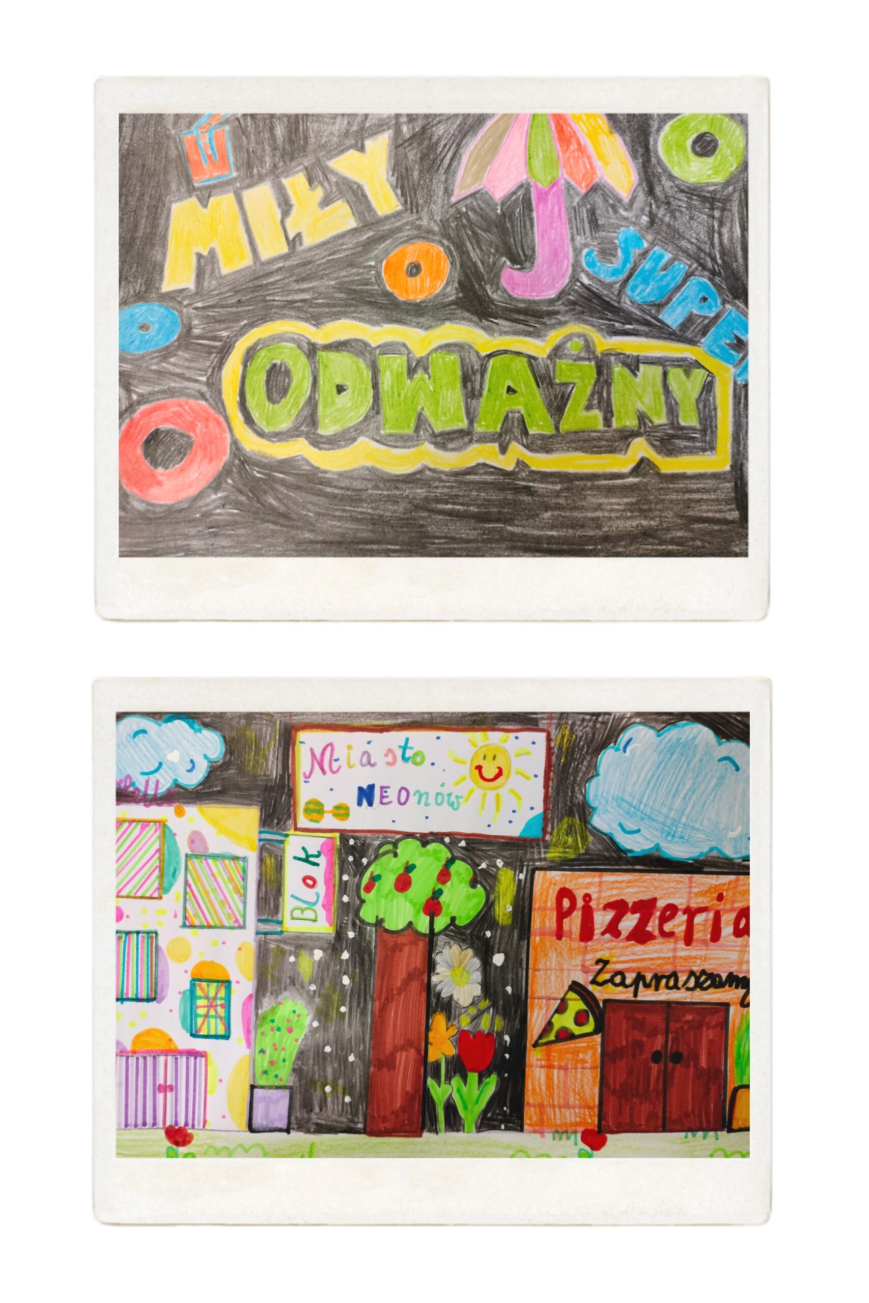 Kolejne prace, które powstały w ramach realizacji zadania projektowego to ,,Miasto neonów”, do którego czwartoklasiści zaprojektowali własne neony.