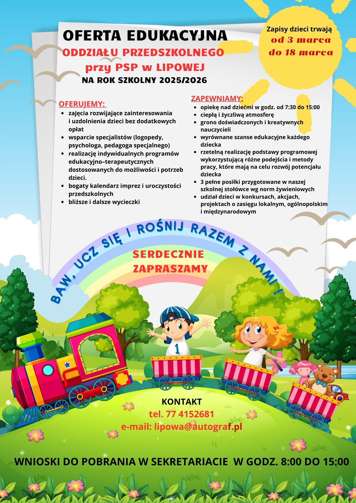 DYREKTOR PUBLICZNEJ SZKOŁY PODSTAWOWEJ W LIPOWEJ OGŁASZA ZAPISY DZIECI DO ODDZIAŁU PRZEDSZKOLNEGO