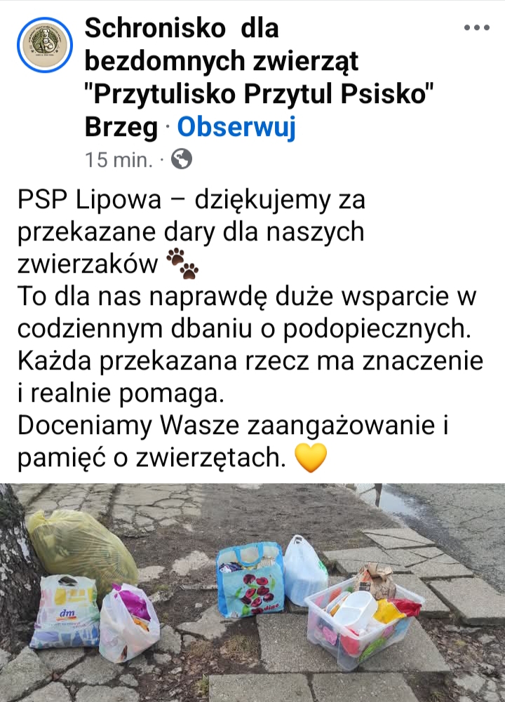 W ramach działań Wolontariatu Szkolnego została zorganizowana zbiórka karmy i innych potrzebnych rzeczy dla psów i kotów przebywających w schronisku. W akcji wzięła udział cała społeczność szkolna. Nasi uczniowie okazali się prawdziwymi przyjaciółmi zwierząt! Dziękujemy za pomoc, wsparcie i okazane serce. Dary zostały przekazane do schroniska dla bezdomnych zwierząt „Przytulisko Przytul Psisko” w Brzegu.